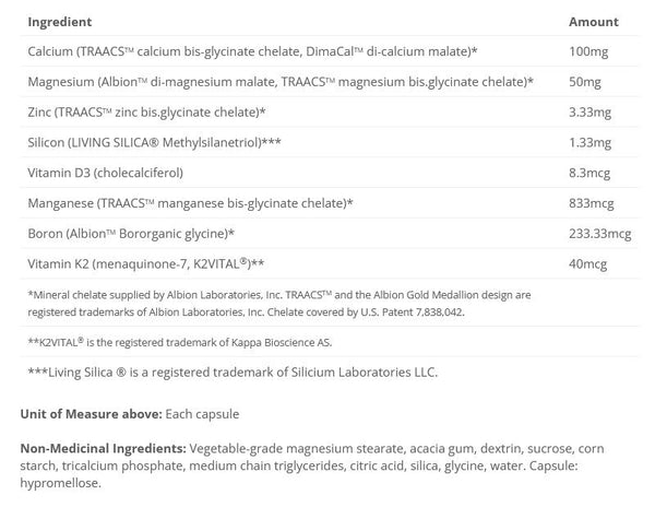 Calcium (TRAACS calcium bis-glycinate chelate, DimaCal di-calcium malate) 100mgMagnésium (Albion malate de di-magnésium, TRAACS chélate de bis-glycinate de magnésium) 50mgZinc (TRAACS chélate de bis-glycinate de zinc) 3,33 mgSilicium (LIVING SILICA methylsilanetriol) 1,33 mgVitamine D3 (cholécalciférol) 8,3 mcgManganèse (TRAACS manganèse bis-glycinate chelate) 833mcgBore (Albion Bororganic glycine) 233.33mcgVitamine K2 (ménaquinone-7, K2VITAL) 40mcg