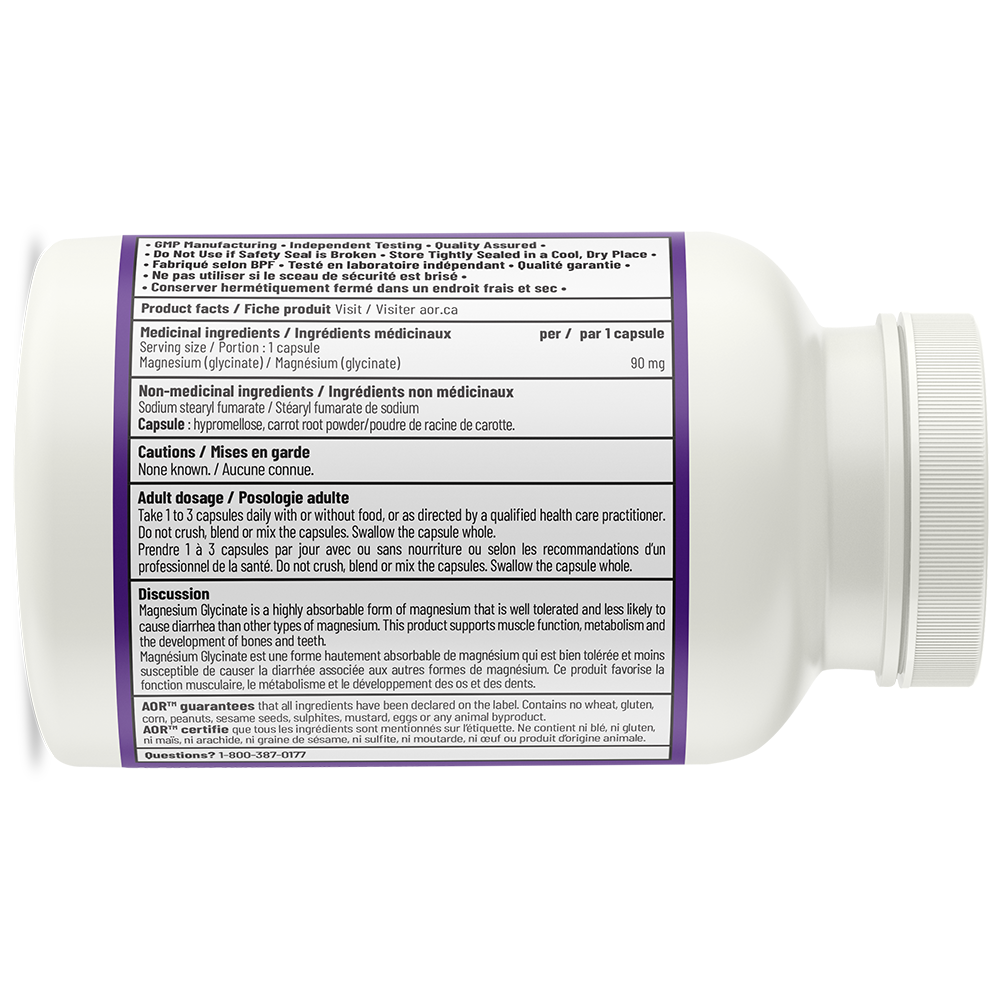 Glycinate de Magnésium d’AOR contient 100 % de glycinate de magnésium pur qui élimine tout risque d’effets secondaires gastro-intestinaux.