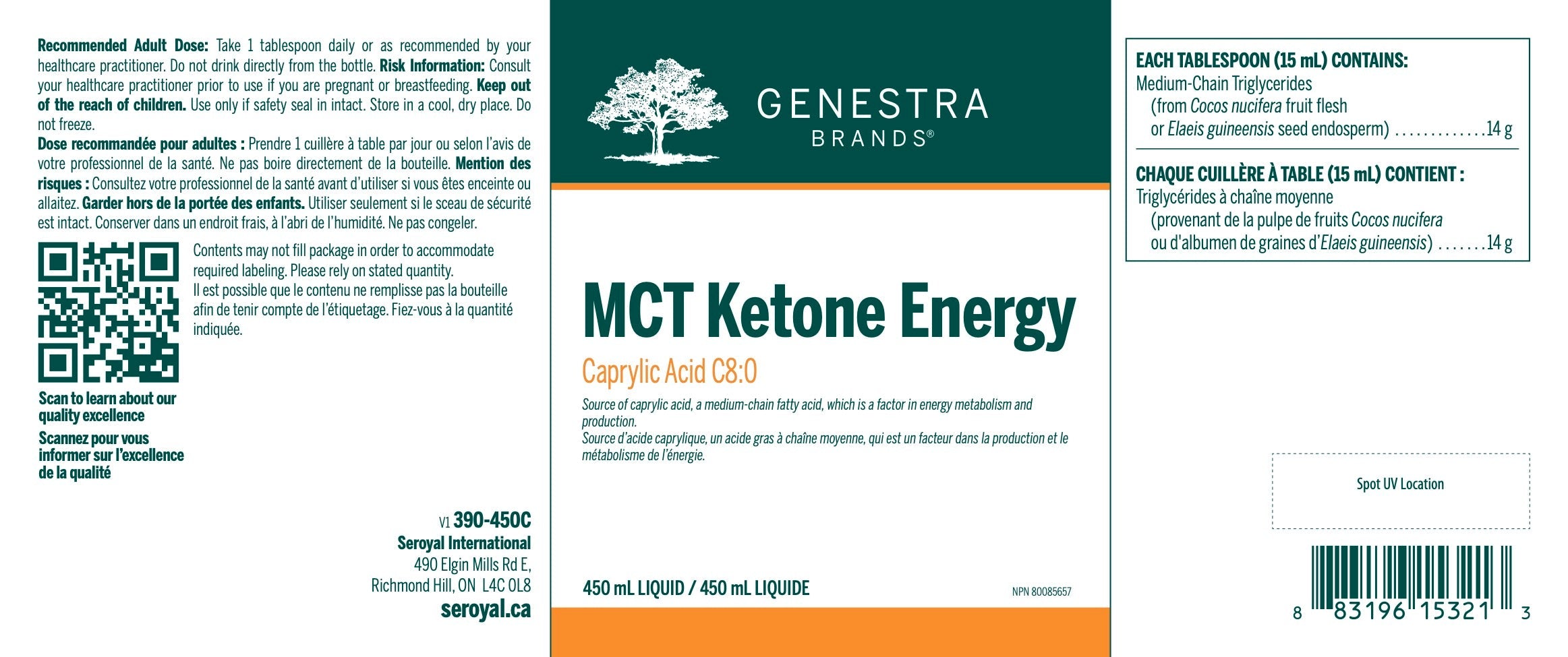 MCT Ketone Energy fournit 14 grammes de MCT par cuillère à table pour soutenir le métabolisme et la production énergétiques. Aussi connu sous le nom d'acide octanoïque, l'acide caprylique est un MCT à huit atomes de carbone naturellement présent dans la noix de coco et l'huile de palmiste. Comme il est rapidement absorbé, qu'il est transporté directement au foie et qu'il traverse aisément la membrane mitochondriale pour subir l'oxydation de Knoop, l'acide caprylique est une source de combustible efficace, facilement assimilée par les tissus adipeux. L'ingestion aiguë de 10 g d'acide caprylique est également reconnue pour augmenter la formation de corps cétoniques, qui sont normalement produits par le foie lorsque la disponibilité du glucose est faible, comme pendant le jeûne ou l'exercice intense. En plus de fournir de l'énergie pour des tissus comme ceux du cœur et des muscles, les corps cétoniques deviennent la principale source secondaire d'énergie du cerveau lorsque la disponibilité du glucose diminue. Un essai clinique a révélé que l'acide caprylique était le MCT le plus cétonique comparativement à l'huile de coco, l'acide caprique (C10:0) ou une combinaison d'huiles. Il a également été suggéré que les MCT soutiennent la production énergétique et la performance pendant l'exercice en régulant la fonction mitochondriale et l'utilisation des glucides, et il pourrait contribuer à un équilibre énergétique négatif en augmentant la dépense d'énergie.