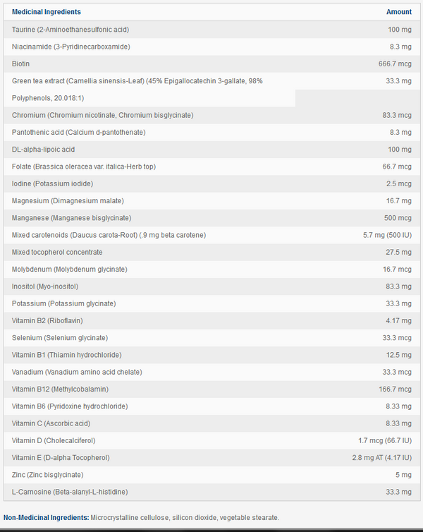 Taurine (acide 2-Aminoéthanesulfonique).................... 100 mgNiacinamide (3-Pyridinecarboxamide)......................8.3 mgBiotine............. 666,7 mcgExtrait de thé vert (Camellia sinensis-Leaf) (45% Epigallocatechin 3-gallate, 98% Polyphenols, 20.0181)........................... 33,3 mgChrome (nicotinate de chrome, bisglycinate de chrome) ..............83.3 mcgAcide pantothénique (Calcium d-pantothénate)....................8.3 mgAcide DL-alpha-lipoïque ..................... 100 mgFolate (Brassica oleracea var. italica-Herb top).................66.7 mcgIode (iodure de potassium) ........................ 2,5 mcgMagnésium (Malate de dimagnésium).................. 16,7 mgManganèse (bisglycinate de manganèse)....................500 mcgCaroténoïdes mélangés (racine de Daucus carota) (.9 mg de bêta-carotène)................. 5,7 mg (500 UI)Concentré de tocophérols mixtes .................. 27,5 mgMolybdène (glycinate de molybdène)......................16.7 mcgInositol (Myo-inositol)....................... 83,3 mgPotassium (glycinate de potassium)..................... 33,3 mgVitamine B2 (Riboavine)....................... 4,17 mgSélénium (glycinate de sélénium)..................33.3 mcgVitamine B1 (chlorhydrate de thiamine) .................... 12,5 mgVanadium (chélate d'acide aminé de vanadium)............33.3 mcgVitamine B12 (Méthylcobalamine) ........................ 166,7 mcg