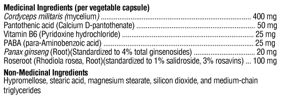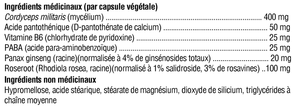 Cordyceps militaris (mycélium) ...... 400 mgAcide pantothénique (D-pantothénate de calcium) ...... 50 mgVitamine B6 (chlorhydrate de pyridoxine) ...... 25 mgPABA (acide para-aminobenzoïque) ...... 25 mgPanax ginseng (racine) (standardisé à 4% de ginsénosides totaux) ...... 20 mgRoseroot (Rhodiola rosea, racine) (standardisé à 1% de salidroside, 3% de rosavine) ...... 100 mg